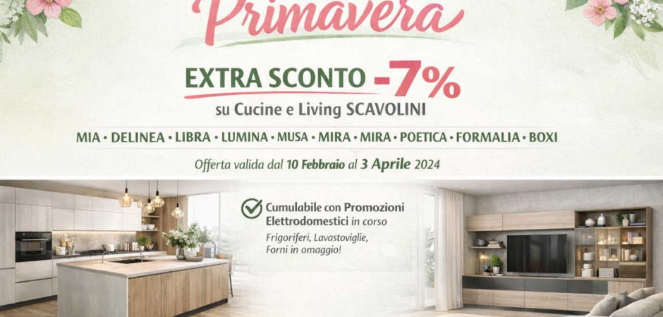 Con la Promozione Primavera Scavolini ottieni uno sconto aggiuntivo del 7% sul prezzo di listino su una selezione di modelli cucina e living.