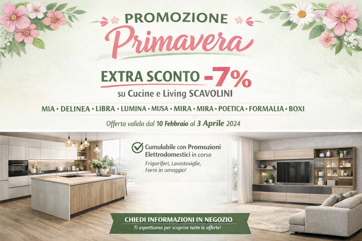 PROMOZIONE PRIMAVERA Extra Sconto 7% su cucine e living Scavolini È il momento giusto per rinnovare casaCon la Promozione Primavera Scavolini ottieni uno sconto aggiuntivo del 7% sul prezzo di listino su una selezione di modelli cucina e living. Modelli in promozione MIA · DELINEA · LIBRA · LUMINA · MUSA – MIRA – POETICA – […]